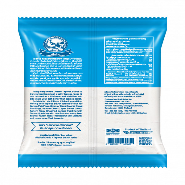 Fancy carp brand Coarse tapioca starch is produced from Tapioca head when touch to feel not soft and not smooth, white texture. Suitable for ingredient with other flour/starch to have more viscosity, shiny. Besides, Coarse tapioca starch has property to make food and sweetmeat not shrink back. Suitable for ingredient of cooking food and sweetmeat such as mixing with Tapioca starch and Rice flour for cooking Kanom Peak Poon, Kanom Guay (Banana Dessert), Kanom Fug Tong (Pumpkin Cake), Kanom Chan (Steamed Layer Cake), Kanom Guy Chay (Steamed Chives Dumplings). Mixing with rice flour for cooking Kanom Nam Dog Mai (Floral Rice Cakes), mixing with Tapioca starch for cooking Tao Suan (Bean Porridge with Coconut Milk), mixing with rice flour and mung bean starch for cooking Kanom Tauy (Thai Coconut Milk Custard.