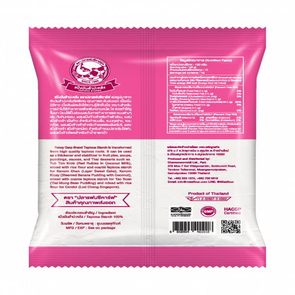 Fancy carp brand Tapioca starch is white texture and produced from good quality tapioca (export grade)when touch feeling slip hand. Suitable for cooking food and sweetmeat to increase viscosity such as Kanom Tub Tim Krob, Kanom Ping (baking dessert), Tao Suan (bean porridge with coconut milk), mixing with rice flour and corn starch for cooking Kanom chan (steamed layer cake), mixing with rice flour for cooking Kanom Lod Chong Singapore (Cendol-Rice Flour Jelly in Sweet Coconut Milk), Kanom Guay (Banana Dessert), Kanom Guy Chay (Steamed Chives Dumplings), mixing with rice flour and glutinous rice flour for cooking Kanom Pla Grim Kai Tao (Sweet Rice Noodles with Coconut Cream), mixing with corn starch for cooking Nam Rad Na (Gravy Sauce)