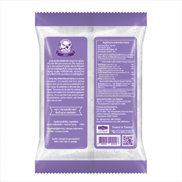 Fancy carp brand Glucose syrup is produced from Tapioca starch, its sweet is 70% of Sugar sweet. Its properties, stable viscosity, not shirk and not crystallized. Suitable for cooking food and sweetmeat such as Kanom Look Choup (Fruit Shaped Mung Beans), Kanom Pia (Chinese Pastry), Glucose syrup property is to make good mixing of sweetmeat paste to be stable shapes. Mixing with Sugar for suitable viscosity sweet sauce. Besides, good for glazing on food and sweetmeat surface to be shined. Able to substitute Corn syrup by Glucose syrup. Suitable for ingredients of Candy, Sauces, Sai Kanom (Sweetmeat Paste Filling), Roast Red Pork Gravy Mix, Kra Ya Sart (Thai Sweet Cereal Bar), Korean Fried Chicken Glaze Sauce, Fried Duck Glaze Sauce, substitute sweet of Sugar.