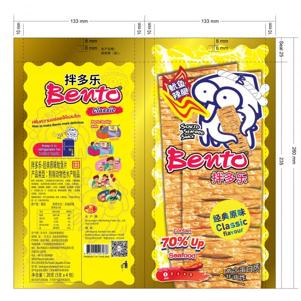 เนื้อปลาหมึกแห้งนุ่ม และ เหนียว สีเหลือง-น้ำตาล กลิ่นและรสชาติเครื่องเทศ / ลักษณะเป็นแผ่นสั้น มีลายตัดขวาง