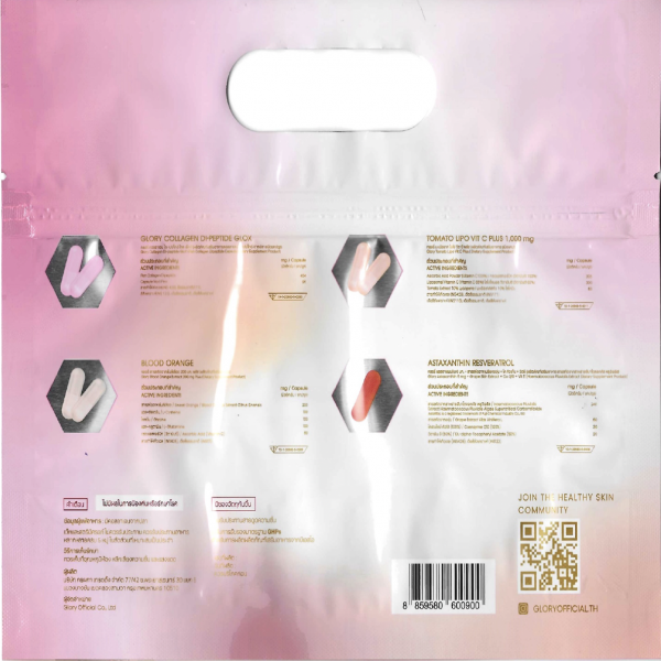 Glory Collagen Di-peptide GloX (Fish Collagen Dipeptide Capsule Dietary Supplement Product) (30 Capsules) + Glory Tomato Lipo Vit C Plus (Dietary Supplement Product Capsule) (30 Capsules) + Glory Blood Orange Extract 200 mg. Plus (Dietary Supplement Product) (30 Capsules) + Glory Astaxanthin 6 mg. + Grape Skin Extract + Co Q10 + Vit E (Haematococcus pluvialis Extract Dietary Supplement Product) (15 Capsules)