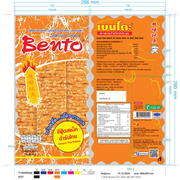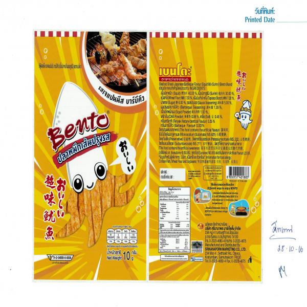 เนื้อปลาหมึกแห้ง เหนียวนุ่ม สีน้ำตาลแดง กลิ่นพริกแดง และรสชาติ เผ็ด หวาน เค็ม / ลักษณะเป็นแผ่นยาว มีลายตัดขวาง
