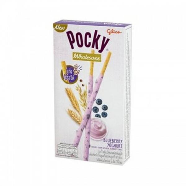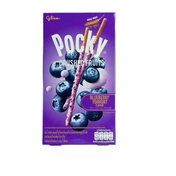 ป๊อกกี้ ครัชฟรุต รสบลูเบอร์รีโยเกิร์ตและเกล็ดบลูเบอร์รีแท้ (บิสกิตแท่งเคลือบรสบลูเบอร์รีโยเกิร์ตและเกล็ดบลูเบอร์รีและเกล็ดคุกกี้)
