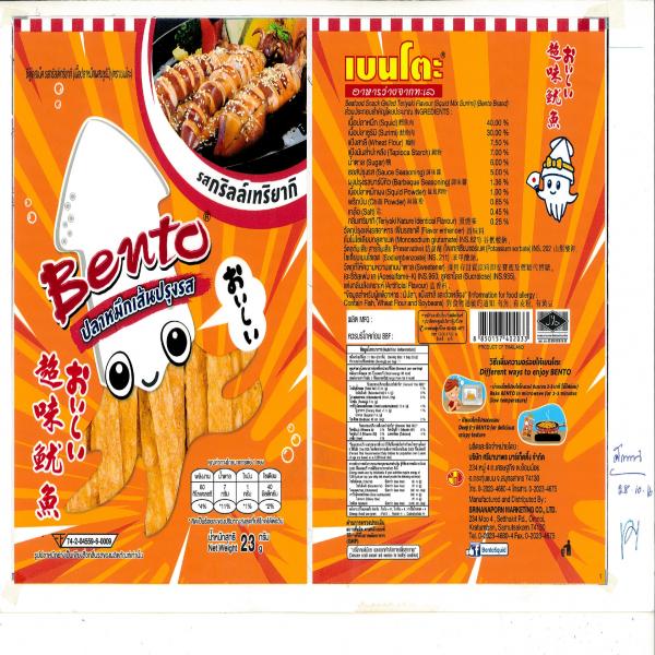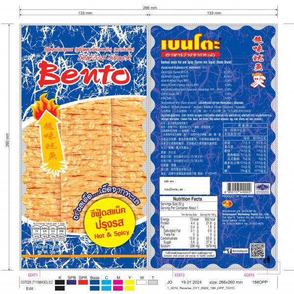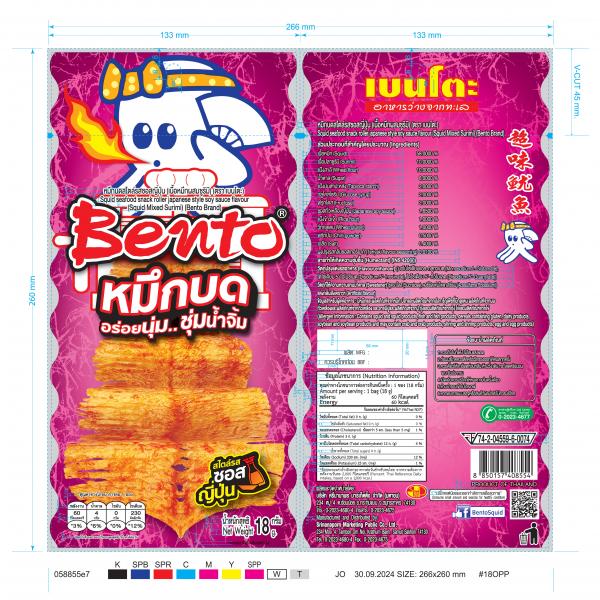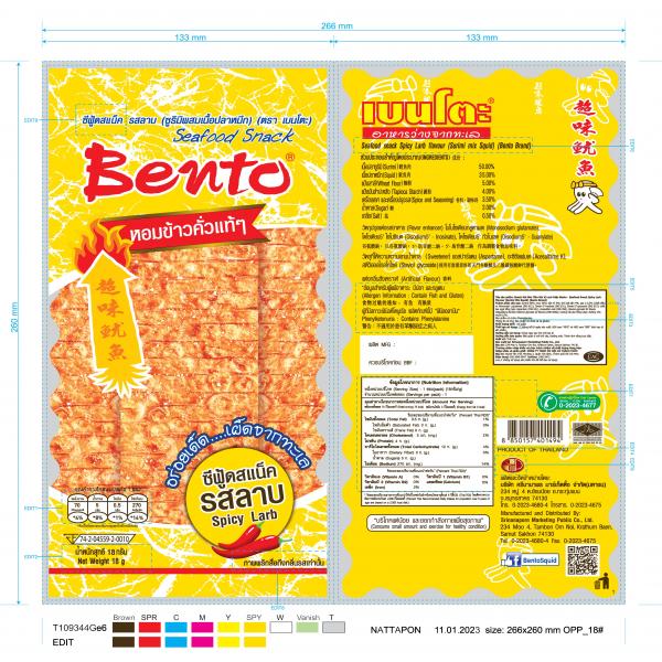 สีน้ำตาล-แดง เนื้อปลาหมึกแห้งเหนียวนุ่ม รสชาติเผ็ด กลมกล่อม กลิ่นพริกและเครื่องเทศ / ลักษณะเป็นแผ่นสั้น มีลายตัดขวาง