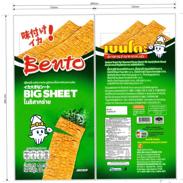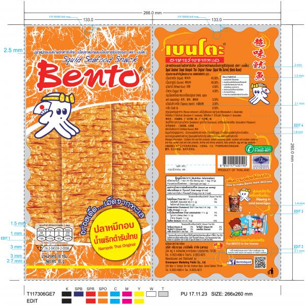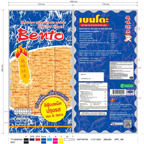 เนื้อปลาหมึกแห้งกรอบเล็กน้อย สีน้ำตาลเข้ม กลิ่นพริกคั่ว มีรสเผ็ดเปรี้ยวกลมกล่อม / ลักษณะเป็นแผ่นยาว มีลายตัดขวาง